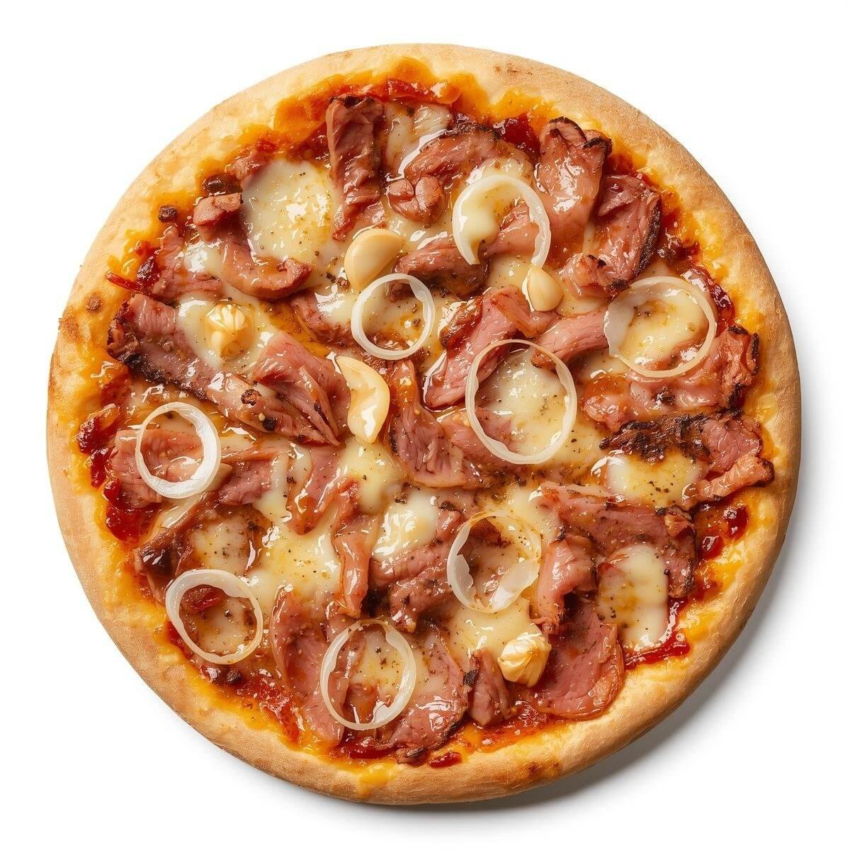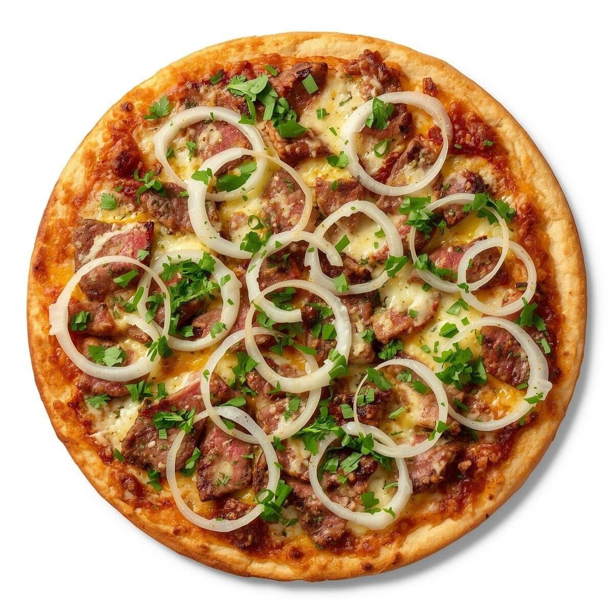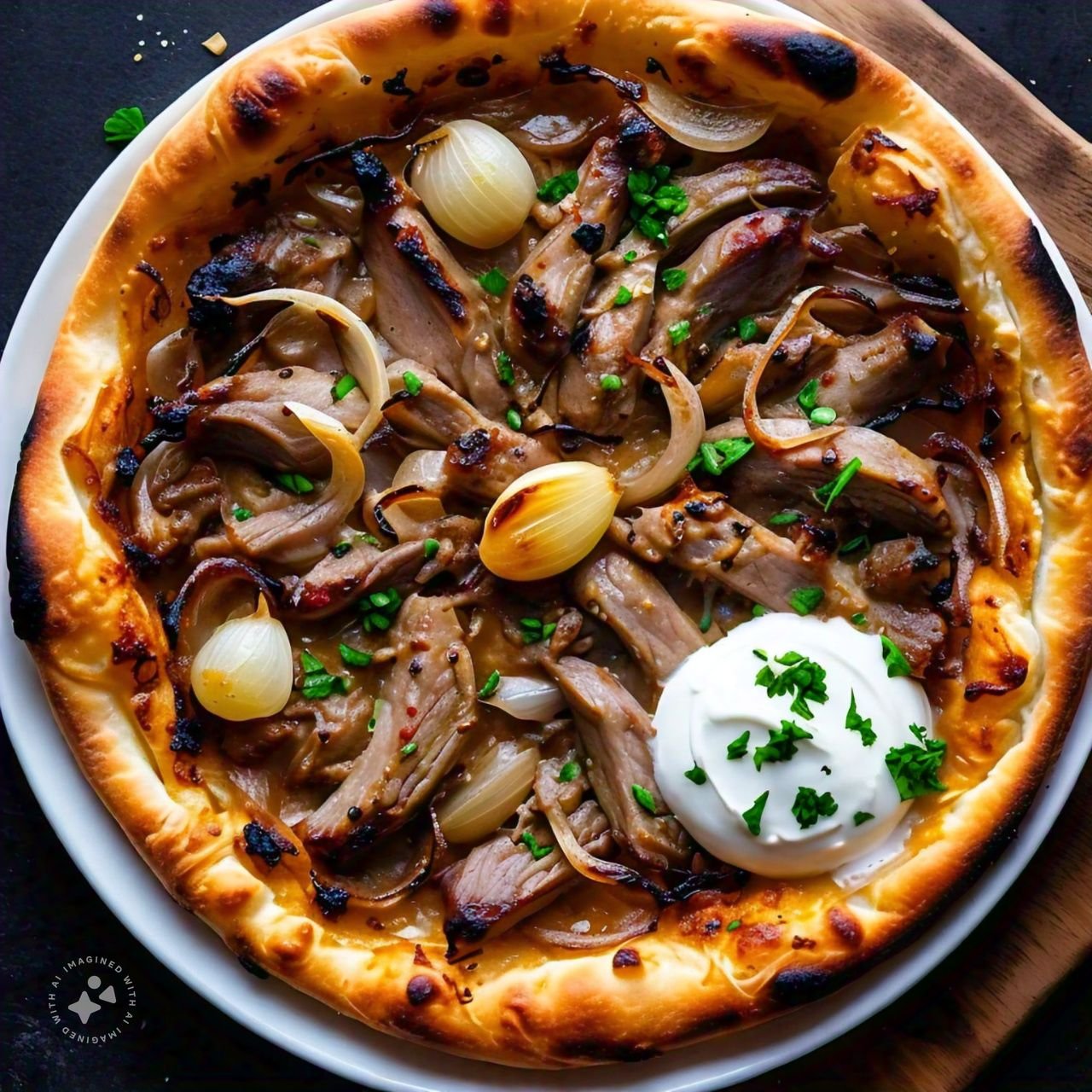 Tarte topped with donner meat, onions, and garlic