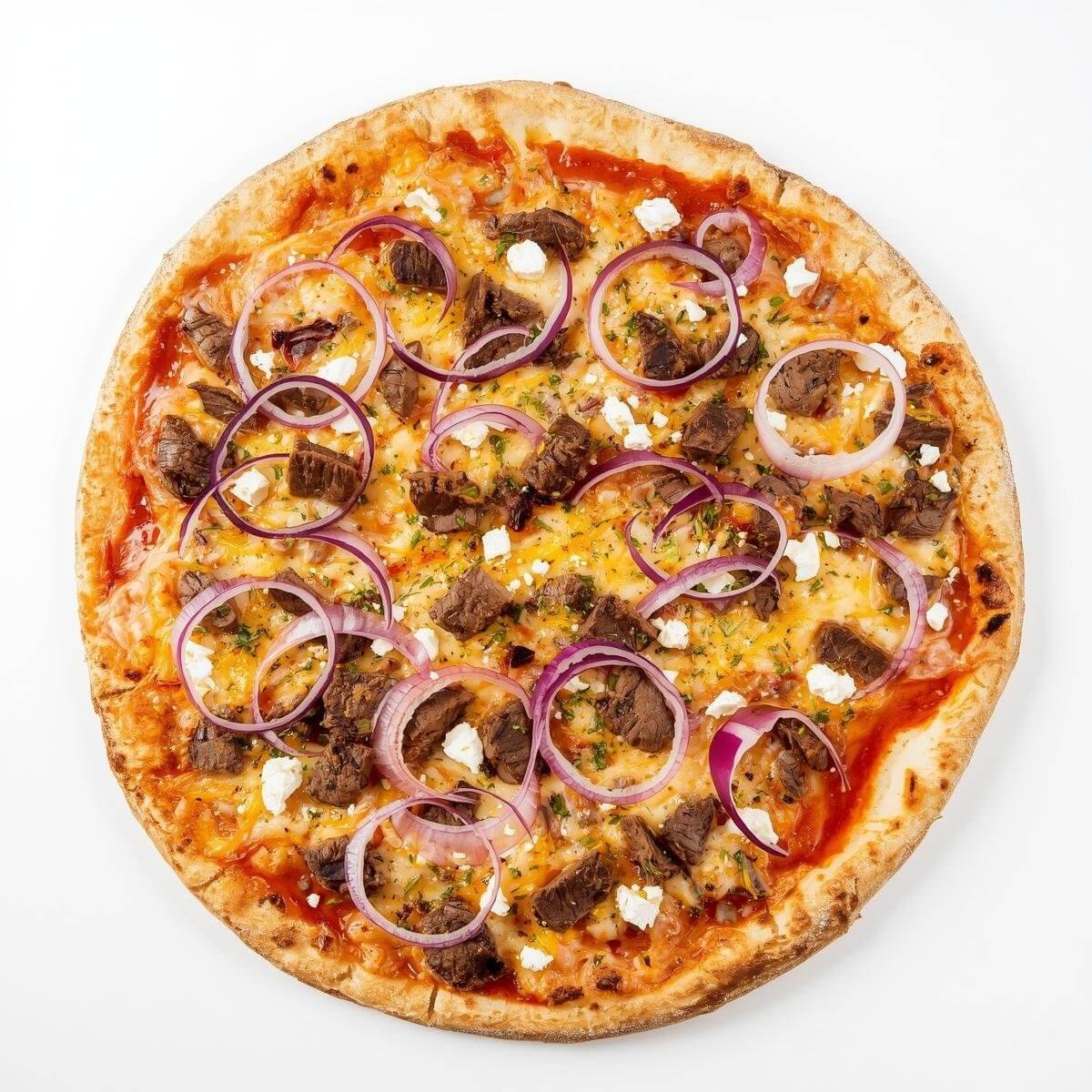 mit Rindfleischkebab, Zwiebeln, Feta und Knoblauch