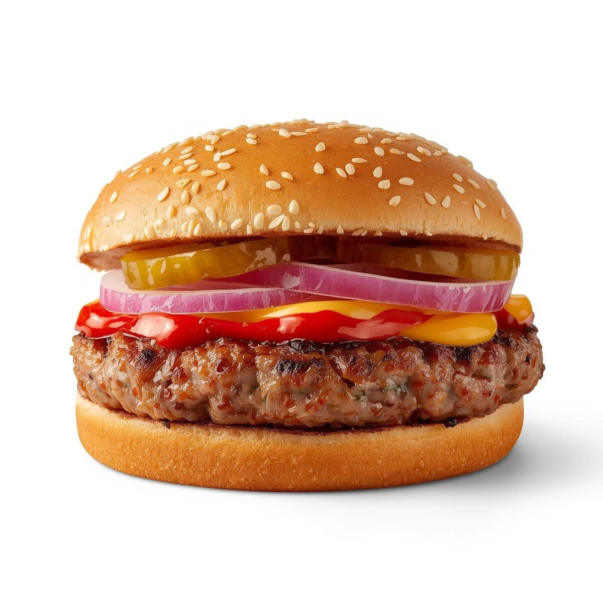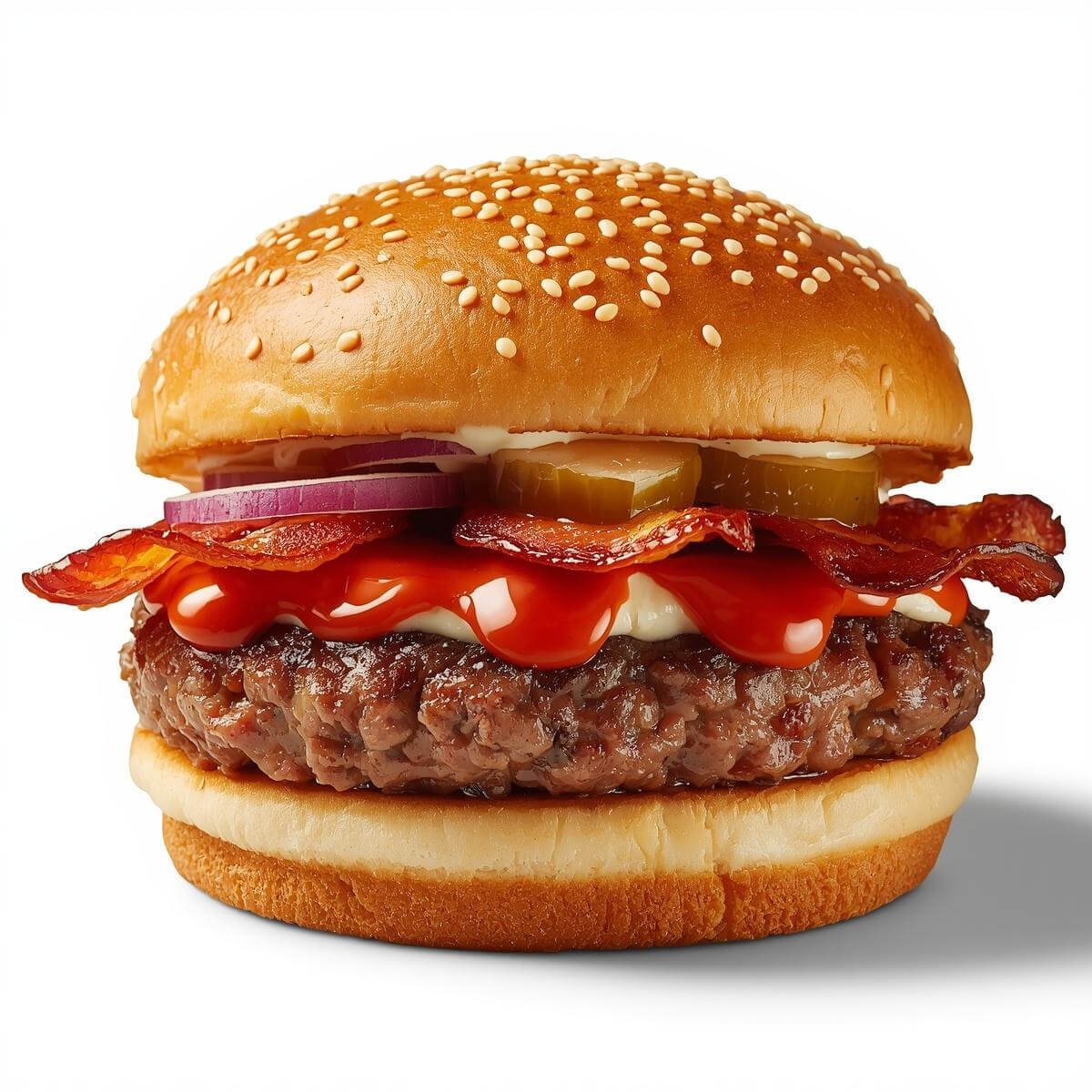 mit Putenbacon, Zwiebeln, Ketchup, hausgemachtem Dressing und Gurken