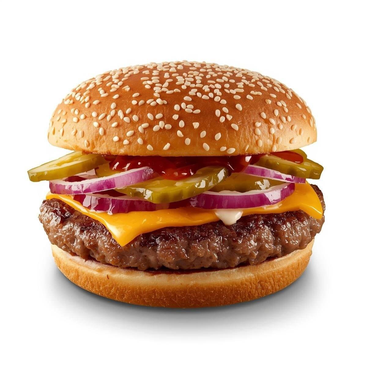 mit 100g Hamburger Patty, Zwiebeln, Ketchup, hausgemachtem Dressing und Gurken