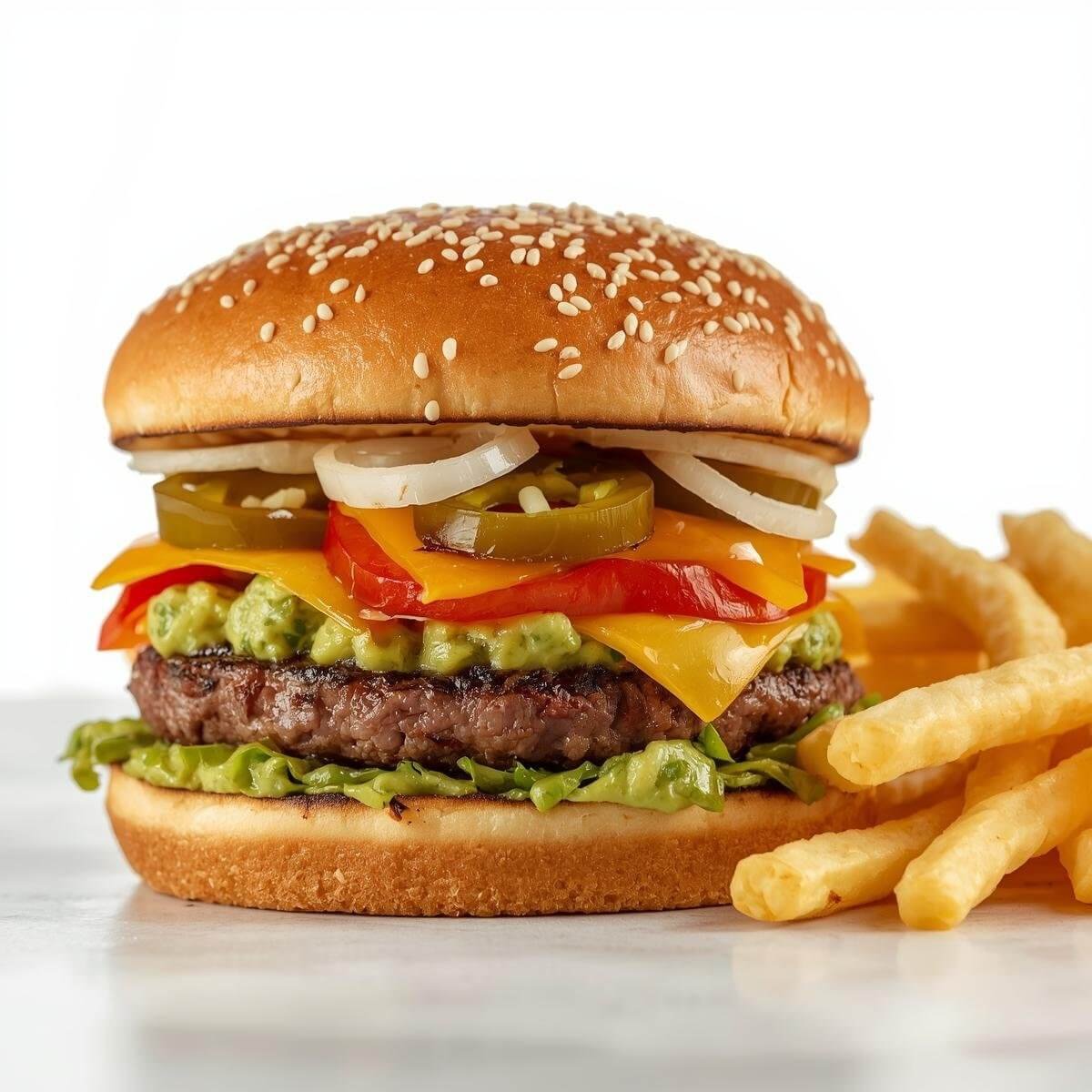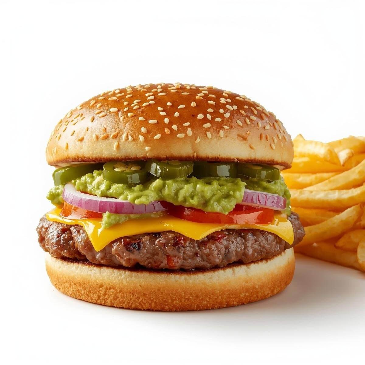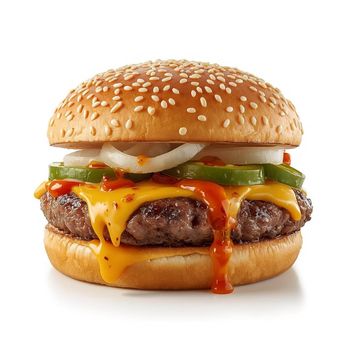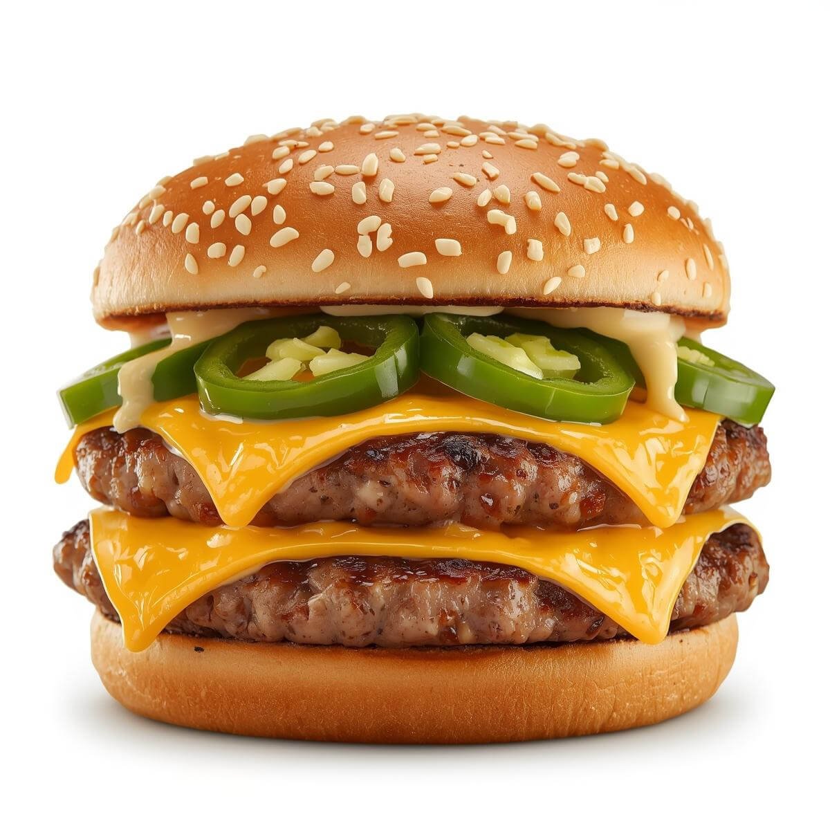 mit doppeltem 100g Burger-Patty, vierfachem Käse, Jalapenos und Knoblauchsoße