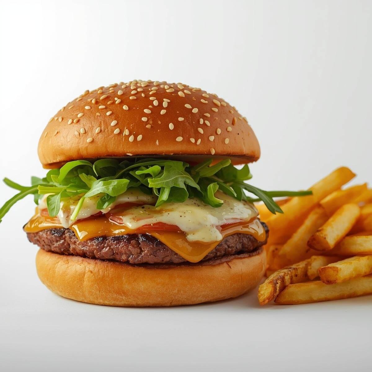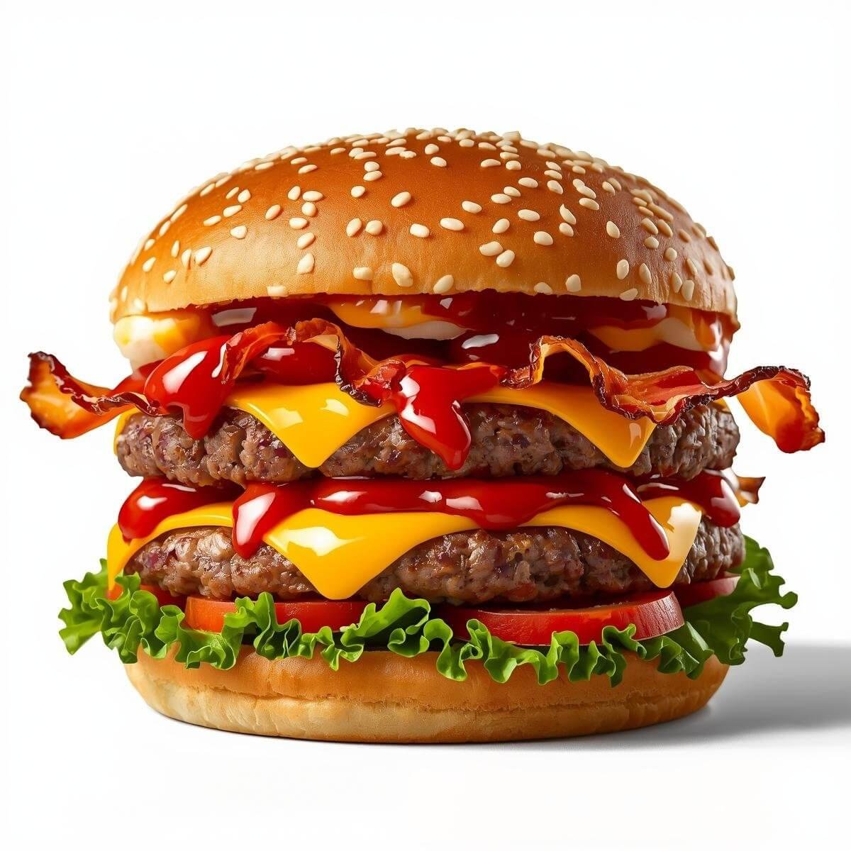 mit doppeltem 100g Burger-Patty, doppeltem Käse, Cocktailsauce, Putenbacon, Ketchup, Salat und Tomaten