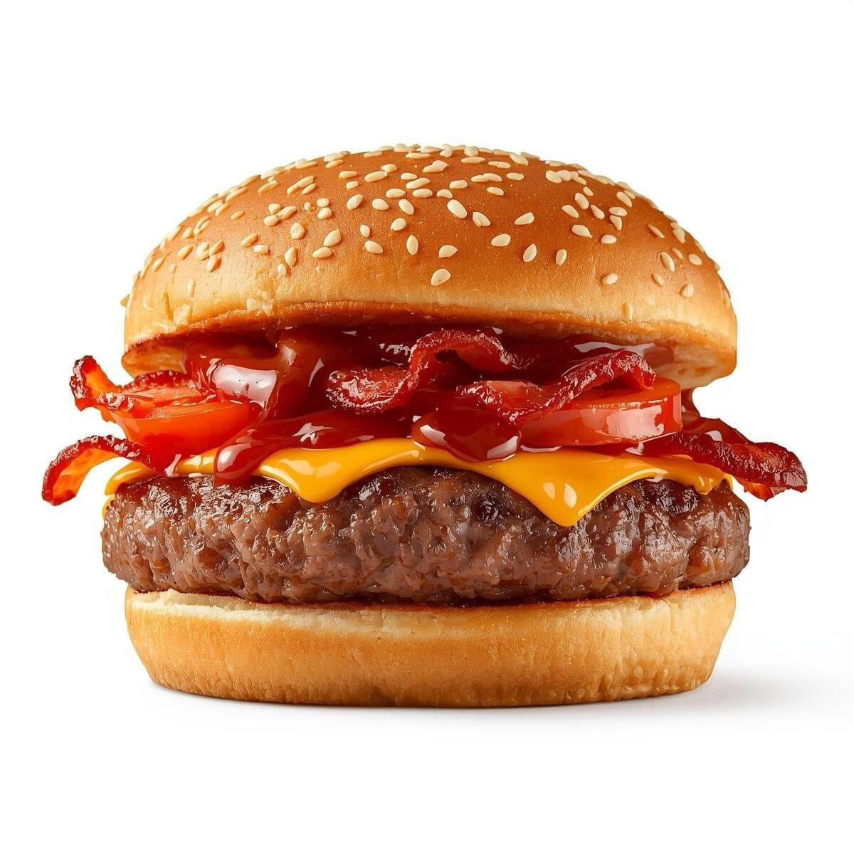 mit Putenbacon, Käse, Tomaten, gerösteten Zwiebeln und Barbecue-Soße