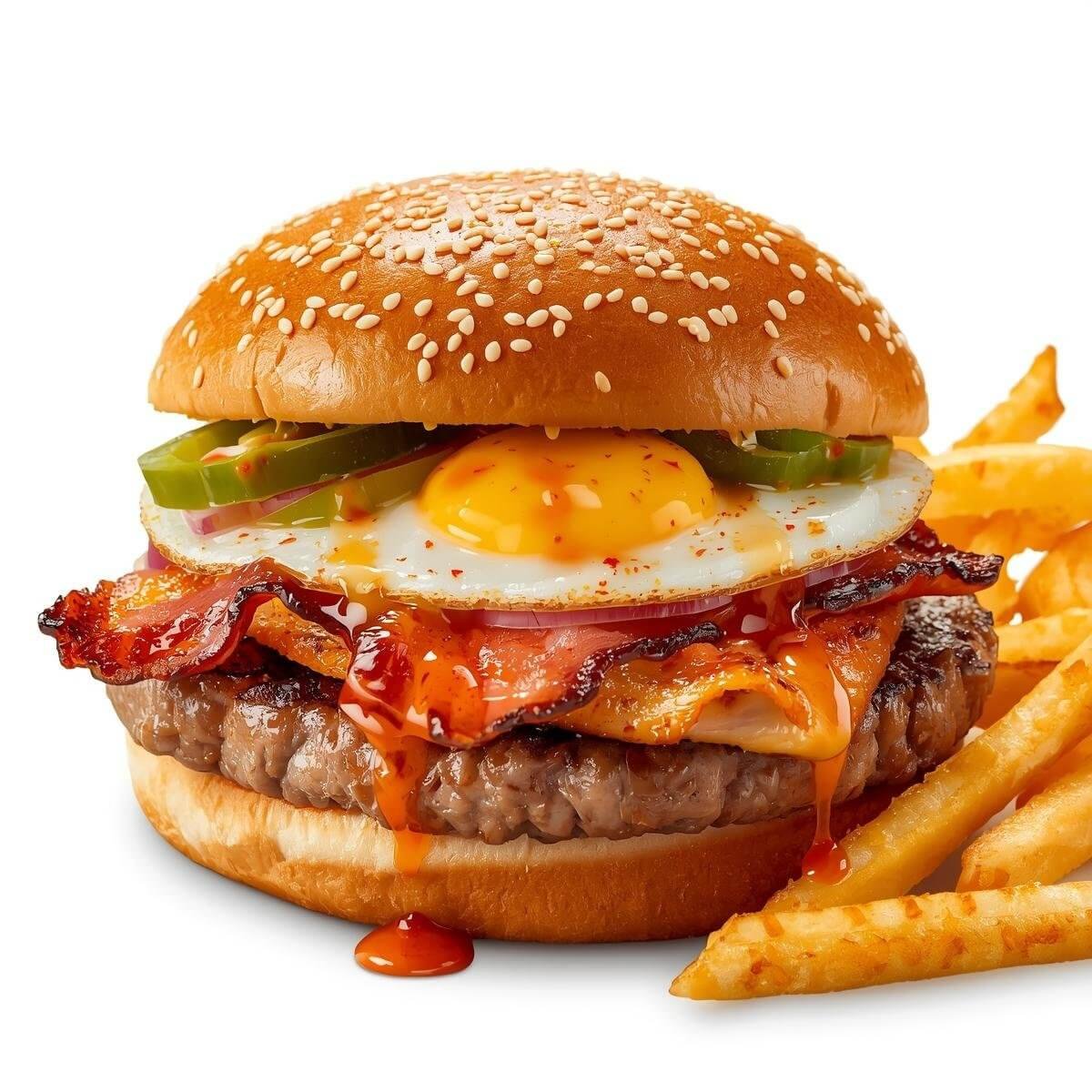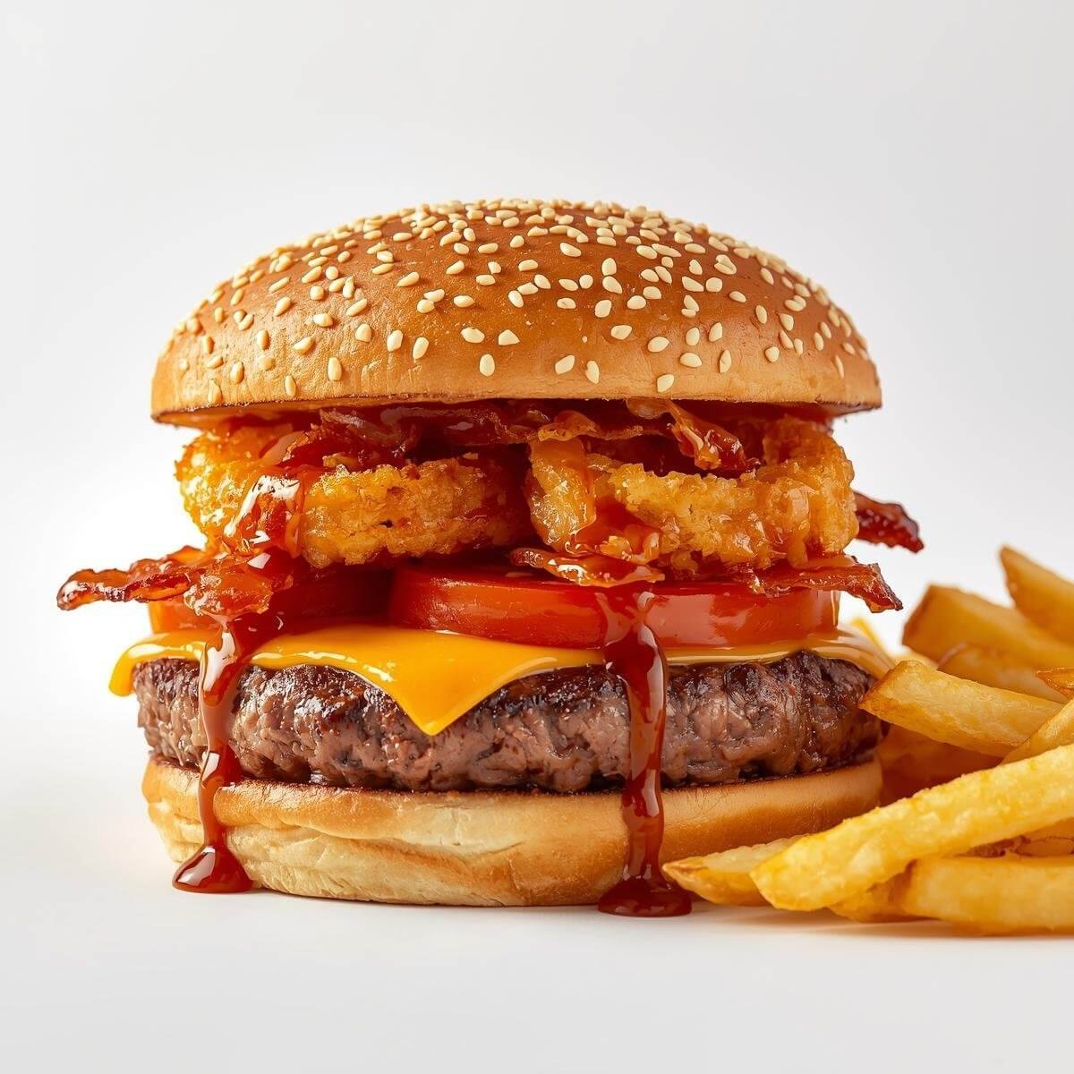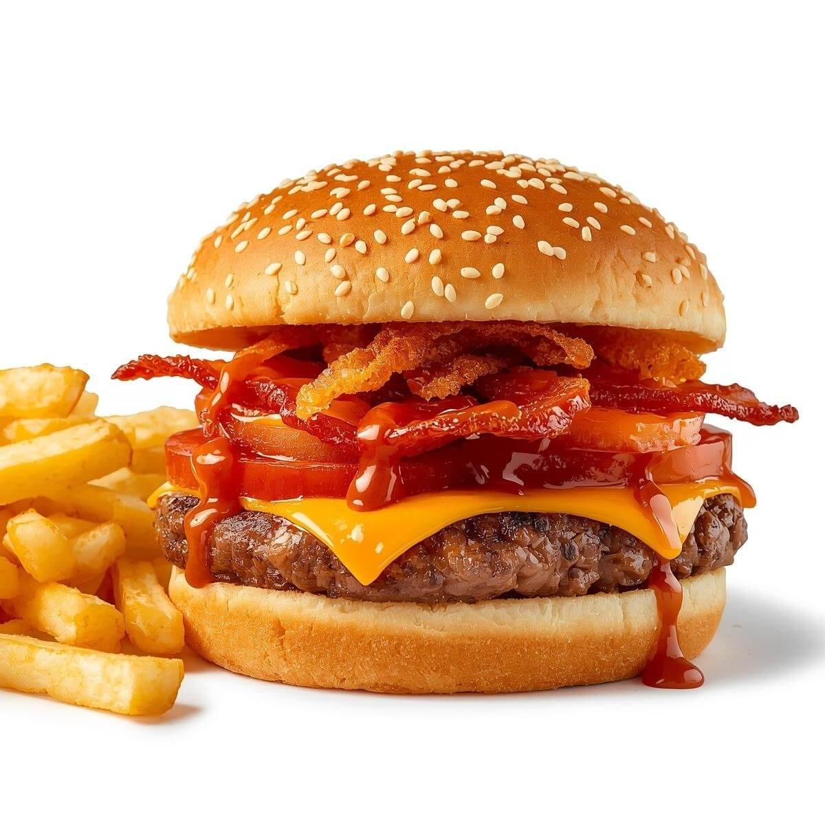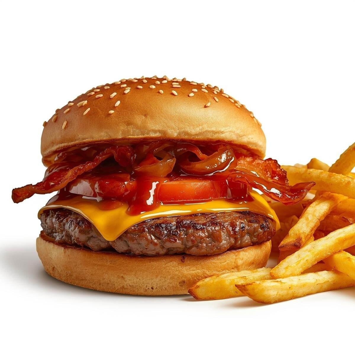 mit Putenbacon, Käse, Tomaten, gerösteten Zwiebeln und Barbecue-Soße und mit French Fries serviert.