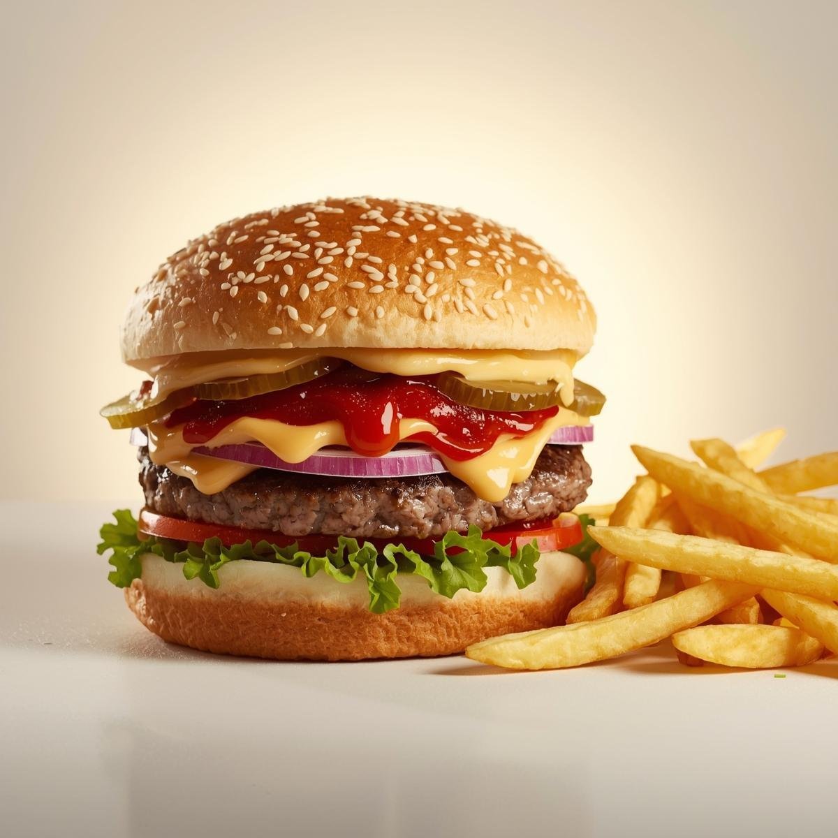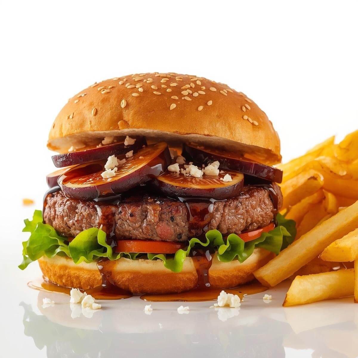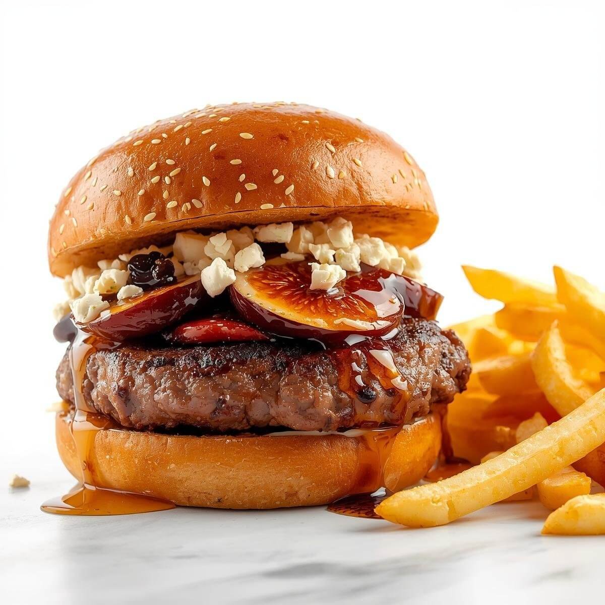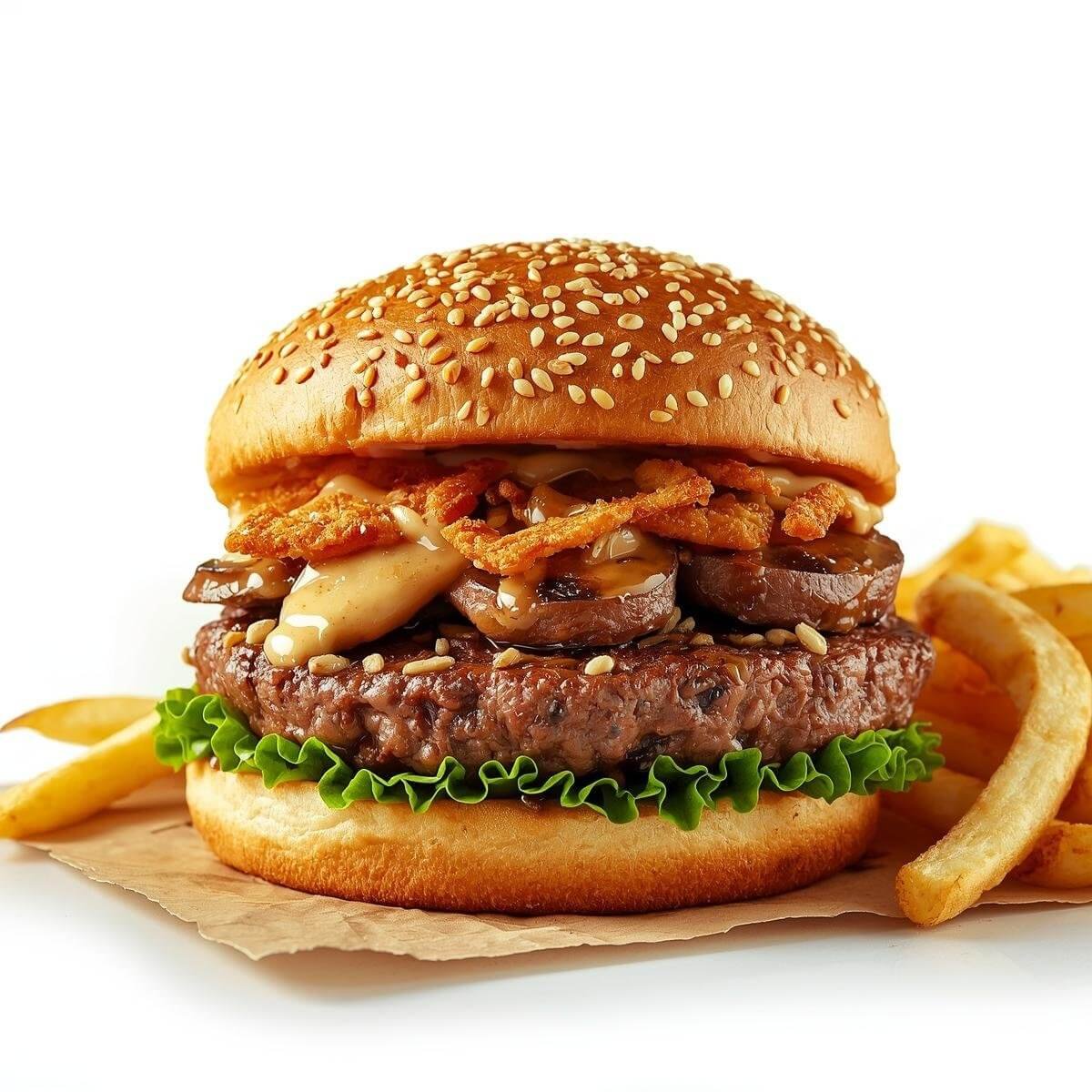 mit Putenbacon, Käse, Tomaten, gerösteten Zwiebeln und Barbecue-Soße und mit French Fries serviert.