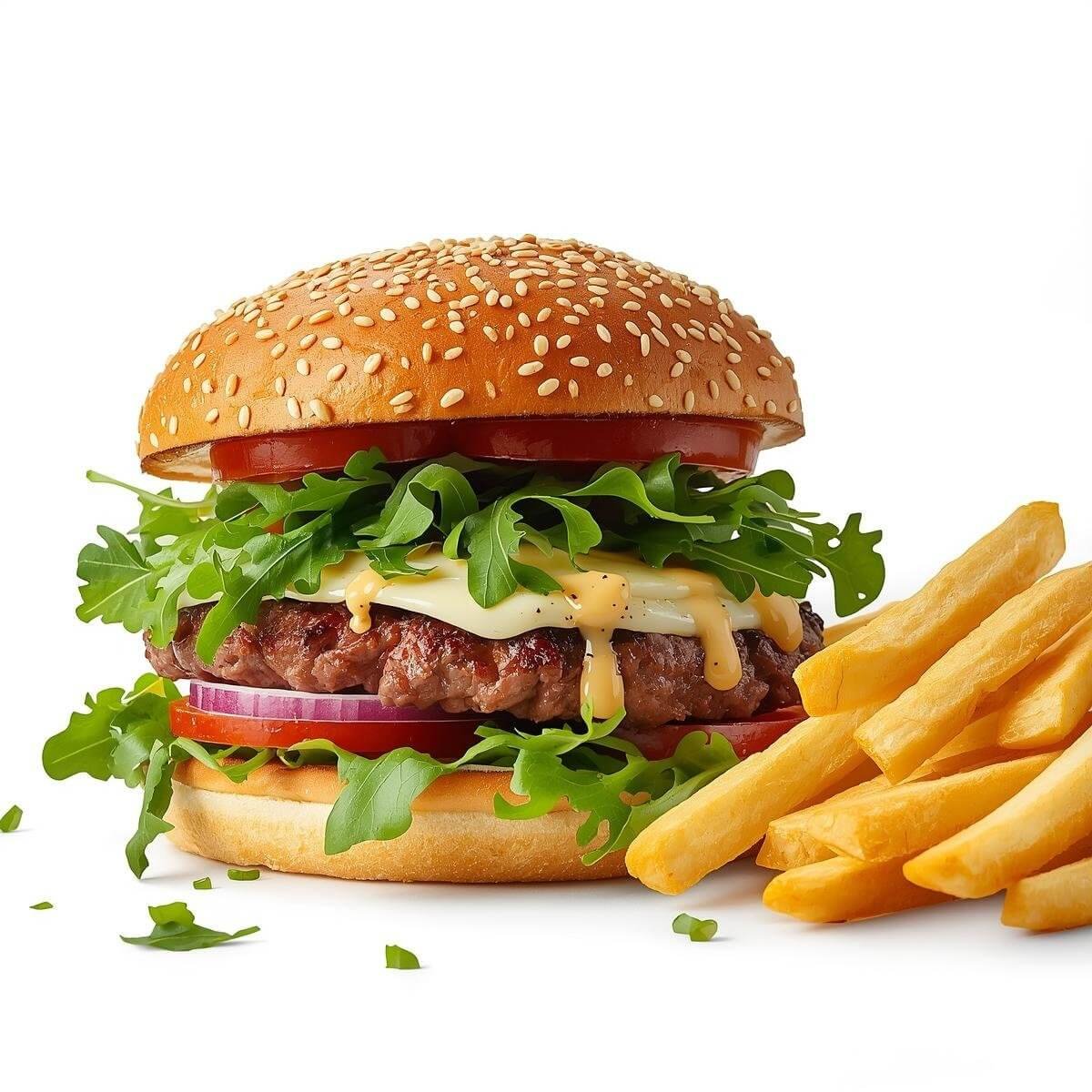 mit Putenbacon, Käse, Tomaten, Zwiebelringen und Barbecue-Soße und mit French Fries serviert.