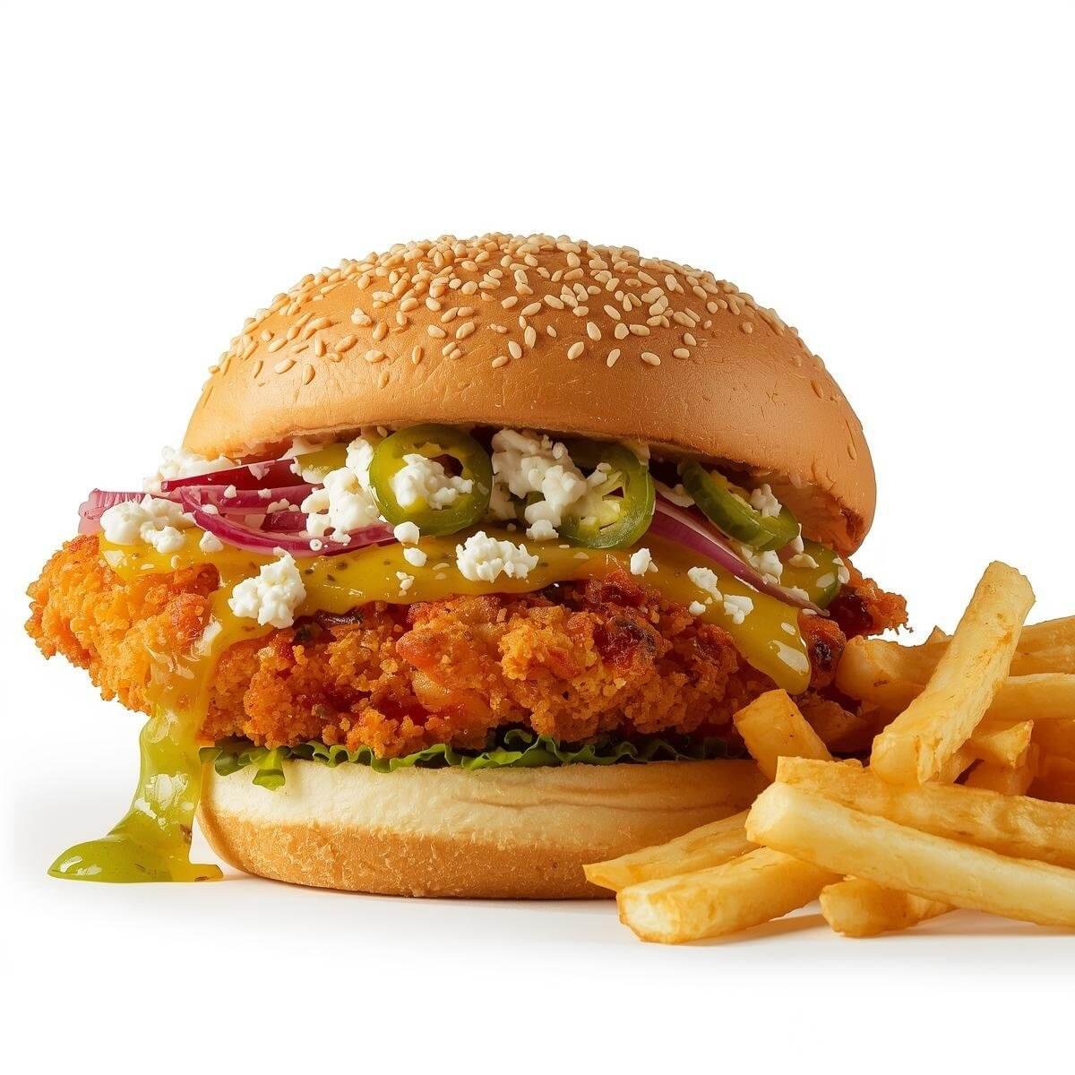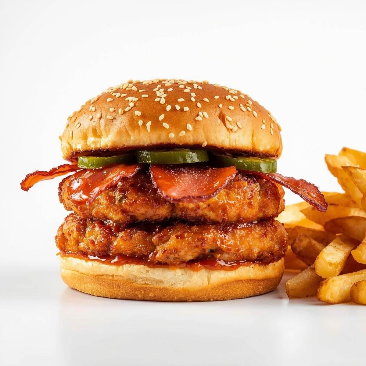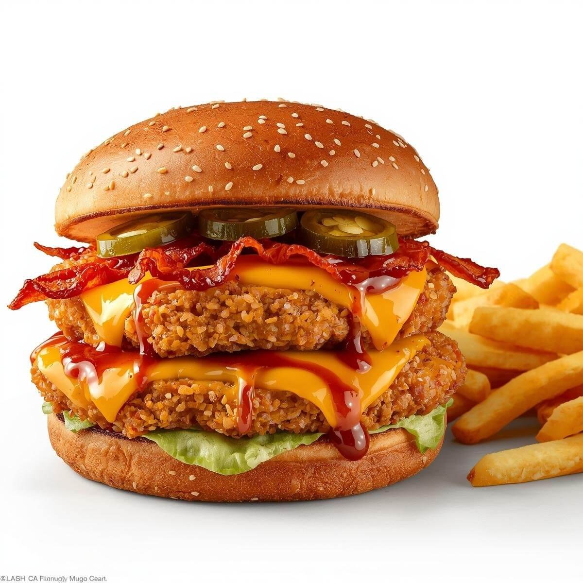 mit Putenbacon, doppeltem 90g Hühnchen-Patty, Jalapenos und Chilisauce