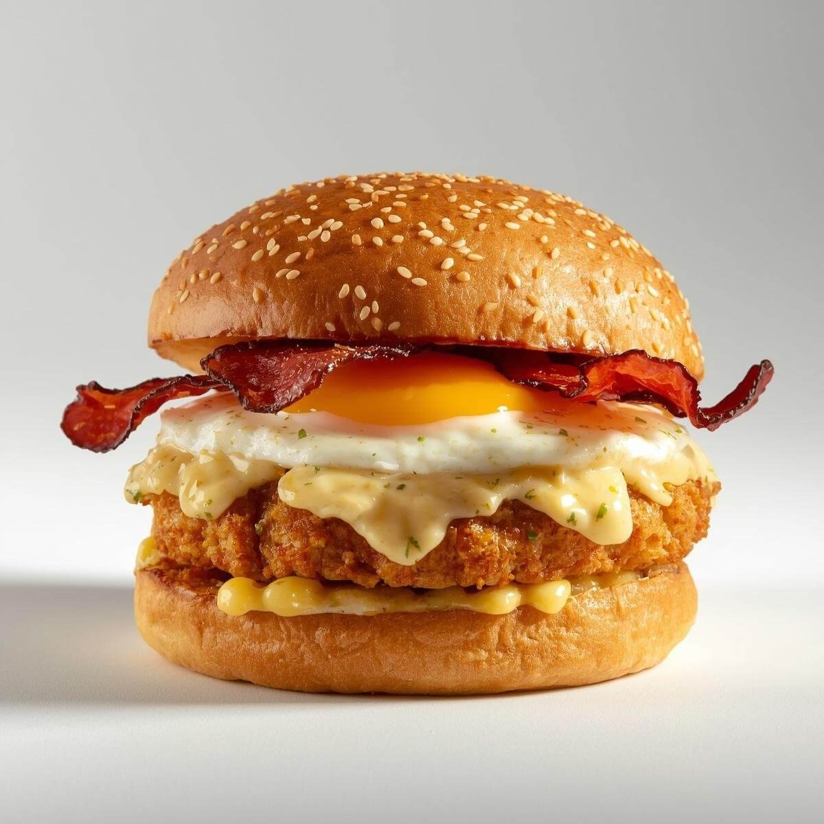 mit 100g Hühnchen-Patty, Bacon, Ei, Mais, Knoblauchsoße und Hausdressing