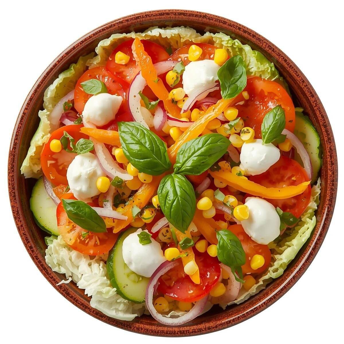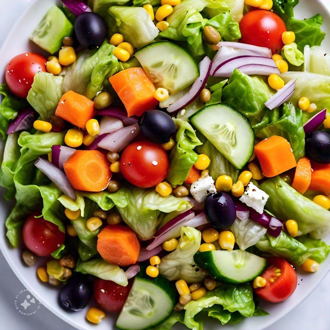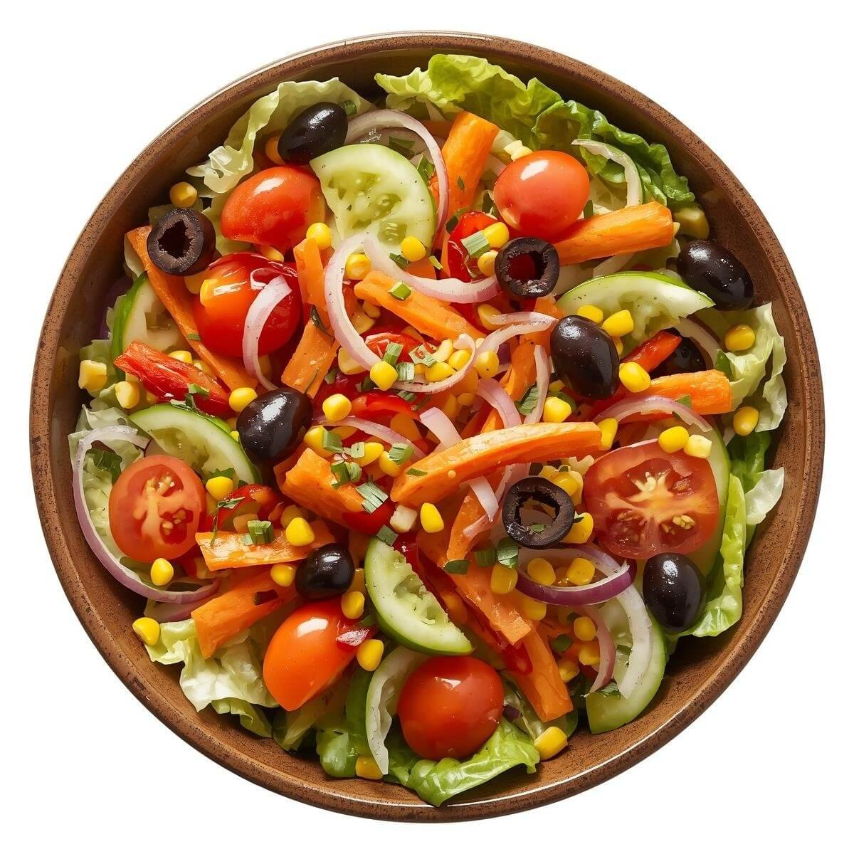 mit Eisbergsalat, Tomaten, Gurken, Karotten, Zwiebeln, Mais, Paprika und Oliven