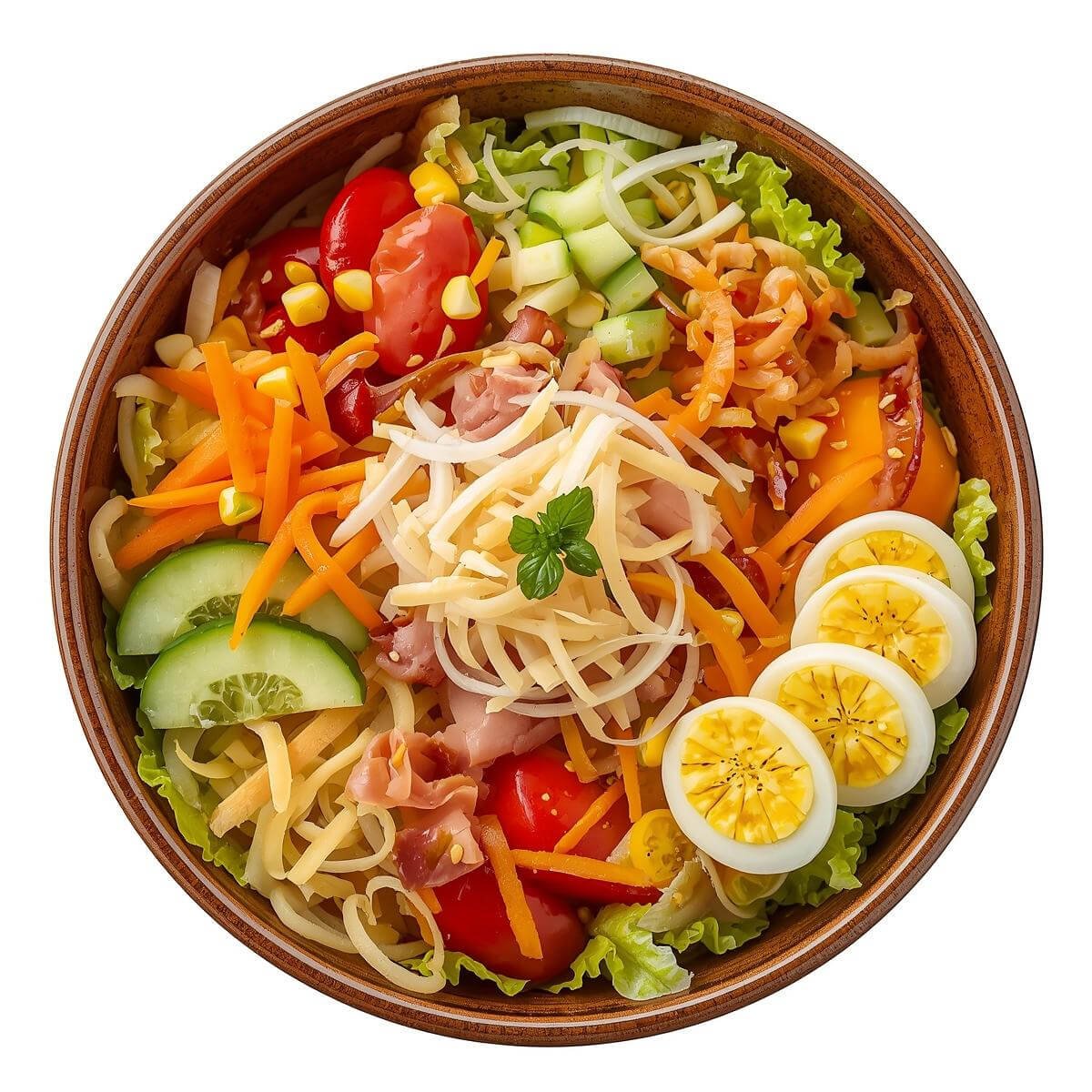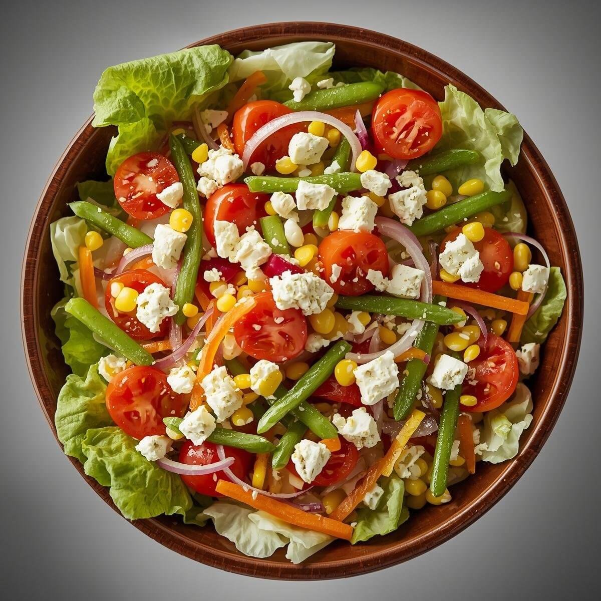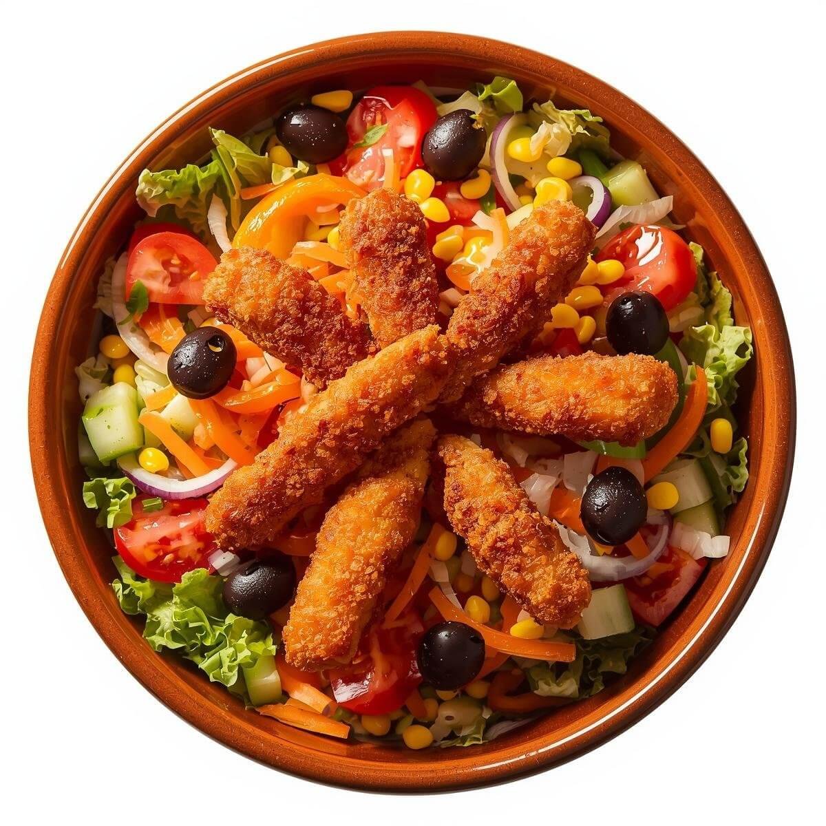 mit Eisbergsalat, Tomaten, Gurken, Karotten, Zwiebeln, Mais, Paprika und Oliven