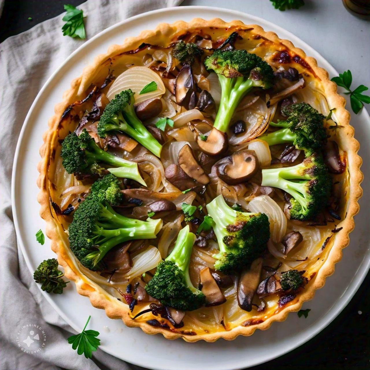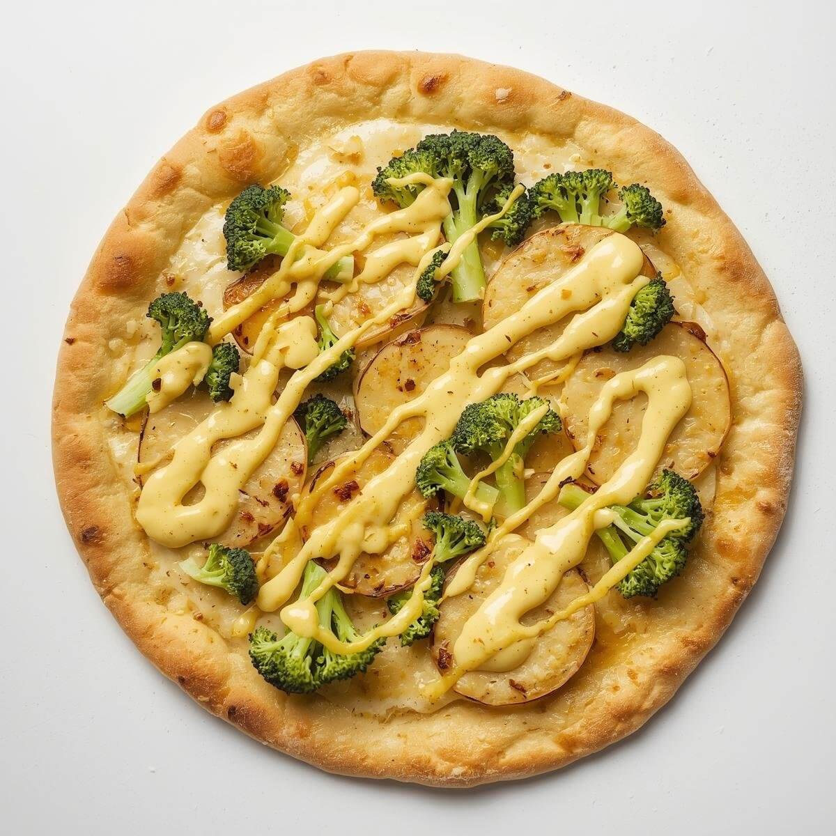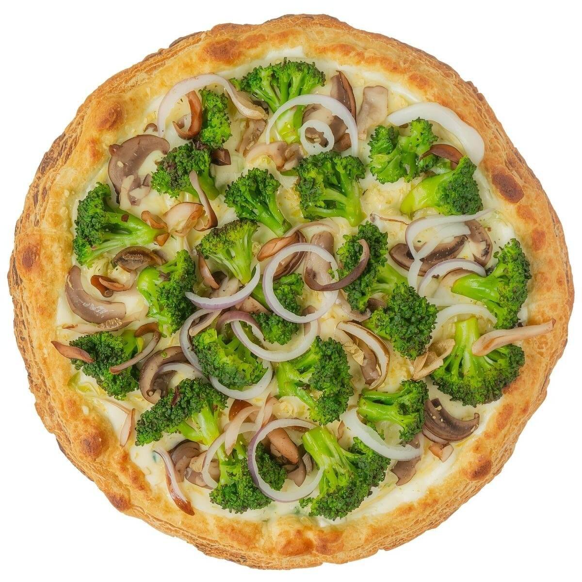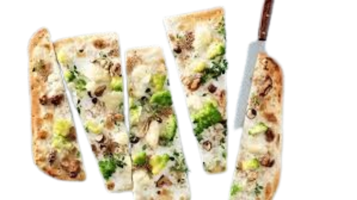 Tarte flambée topped with broccoli, onions, and mushrooms