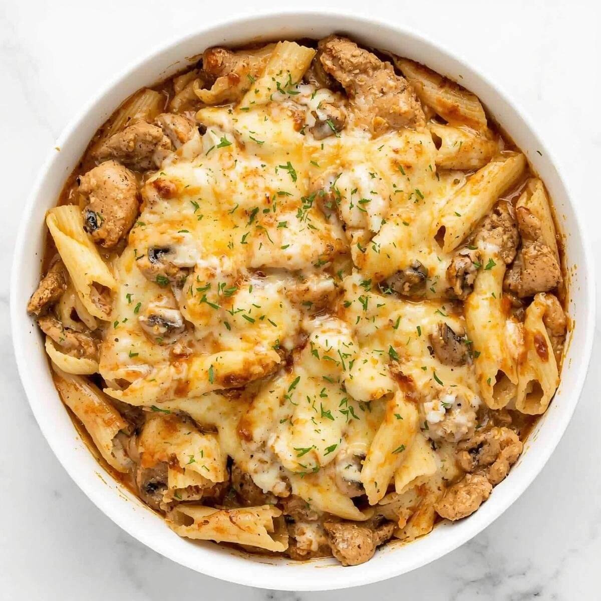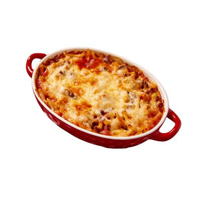 Alforno mit Hühnchen, Cremesauce, Champignons, Knoblauch, überbacken mit Rigatoni und Käse