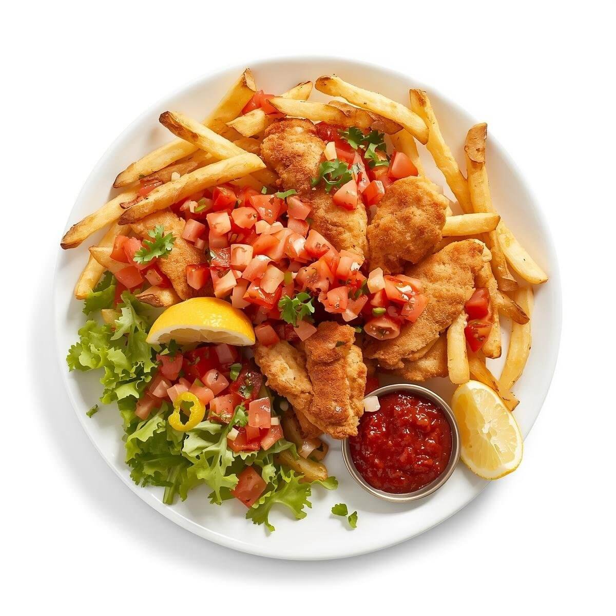 Pommes Frites mit Tomaten, mariniertem Hühnchen, Salat, Paprika, Zitrone und Chili-Dip