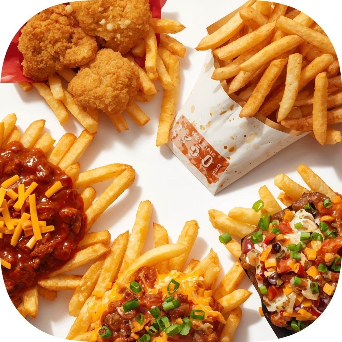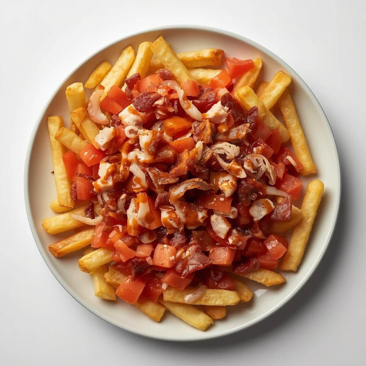 Pommes Frites mit Bacon, Pute, gerösteten Zwiebeln und Barbecue-Dip