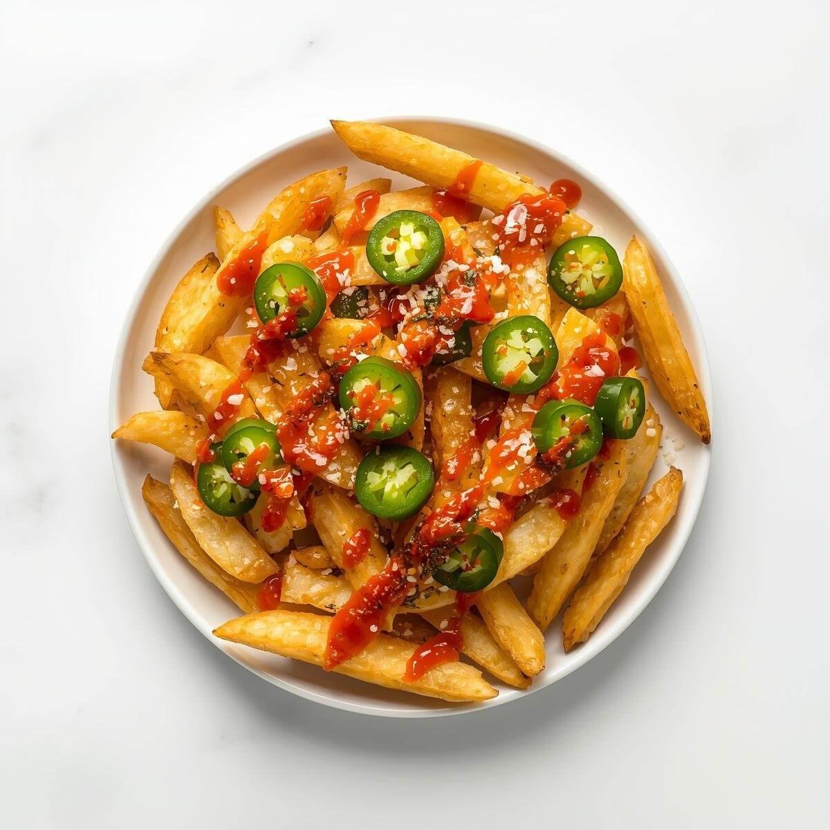 Pommes Frites mit Jalapenos, scharfer Chilisauce und Knoblauch-Dip