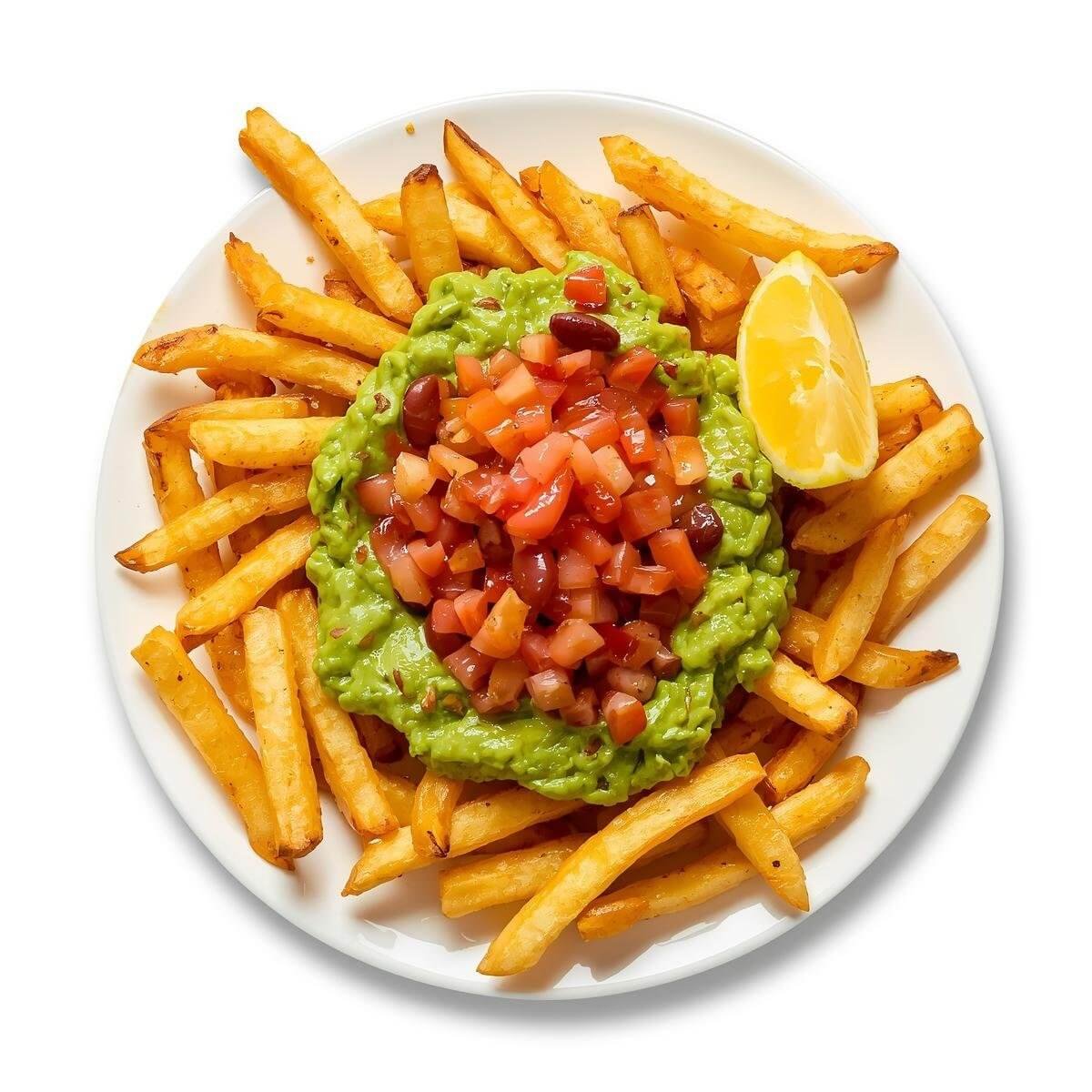 Pommes Frites mit Guacamole, Tomaten, Bohnen, Zitrone und Knoblauch-Dip