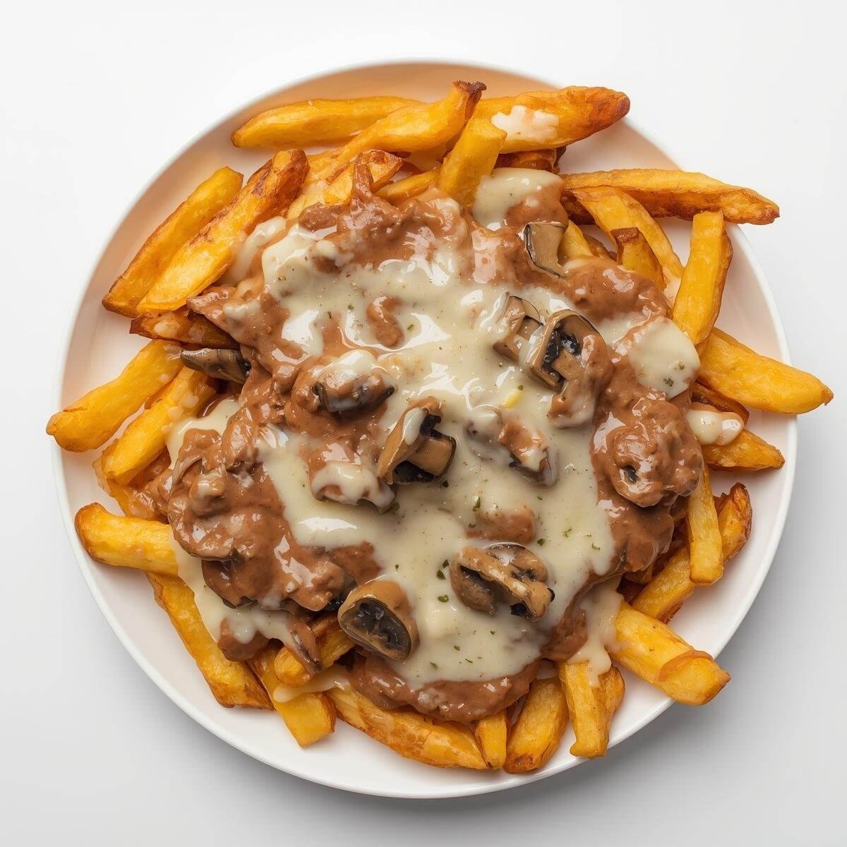 Pommes Frites mit Champignon-Cremesauce und Mozzarella