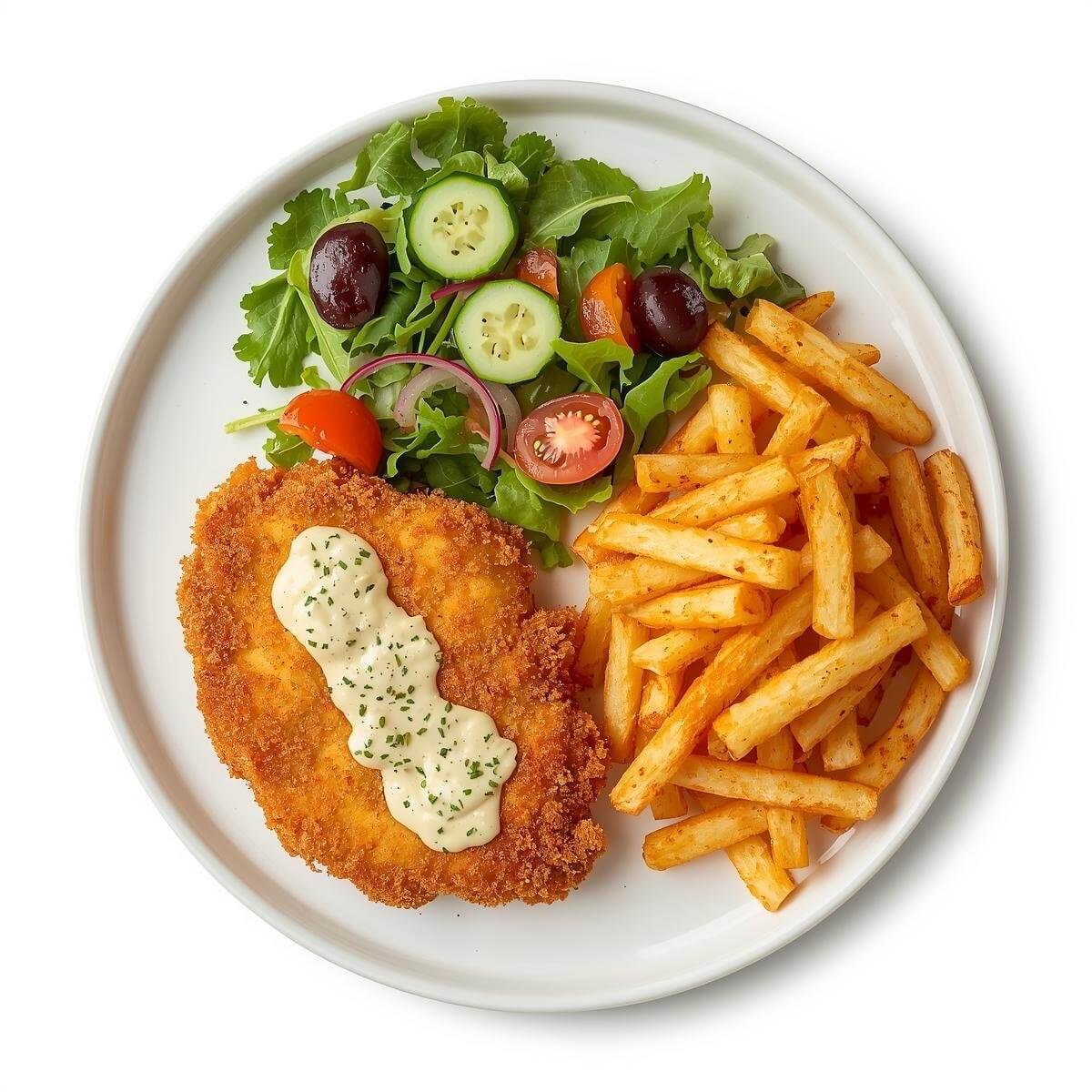 Crispy fried chicken, cheese, Knoblauch sauce,Salat, feta käse, jalapeño