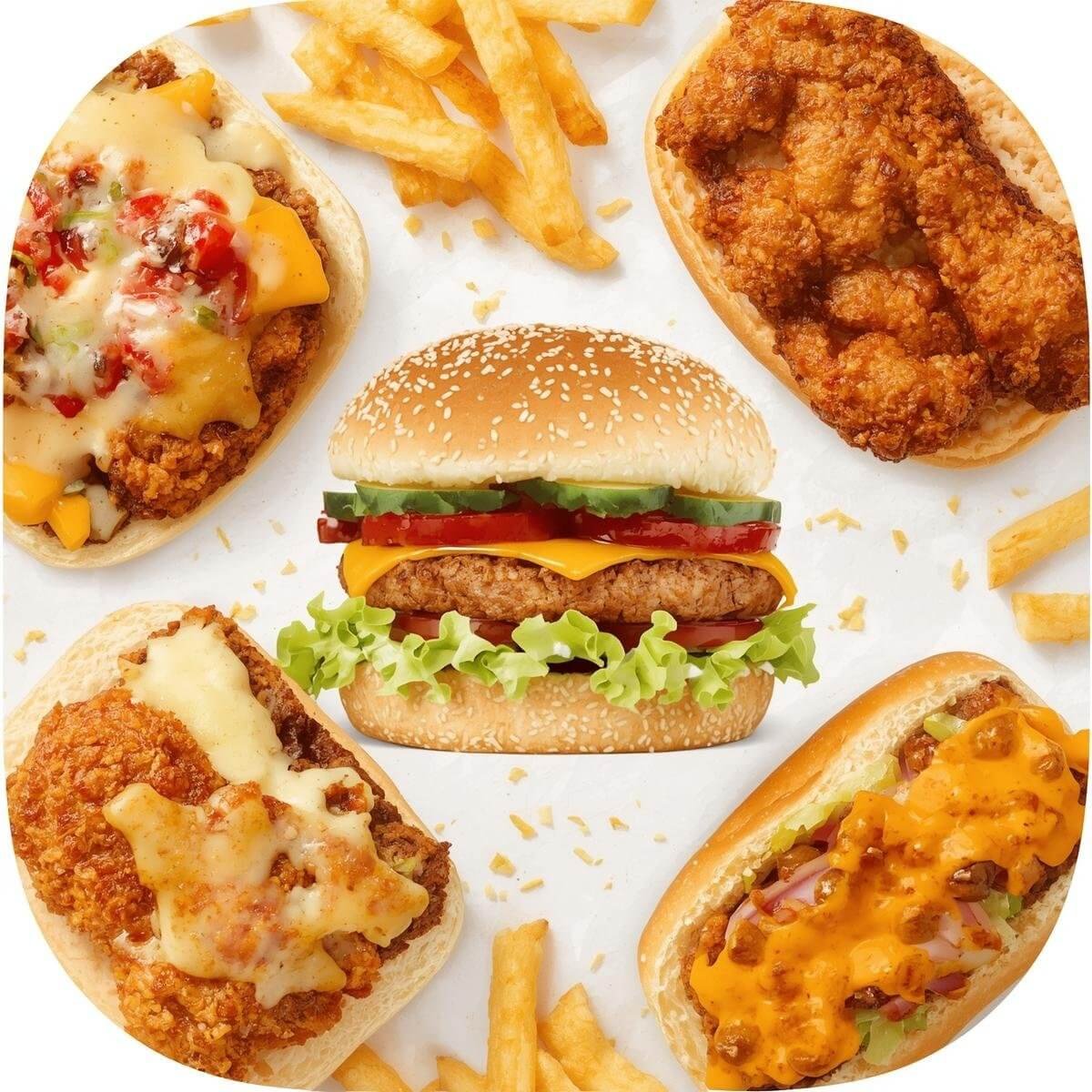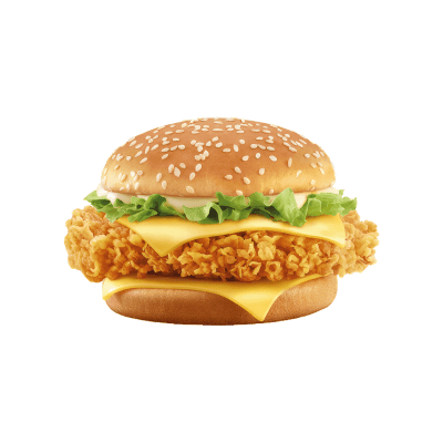 mit 100g Hühnchen-Patty, Tomaten, Zwiebeln, Gurken und süß-saurer Soße