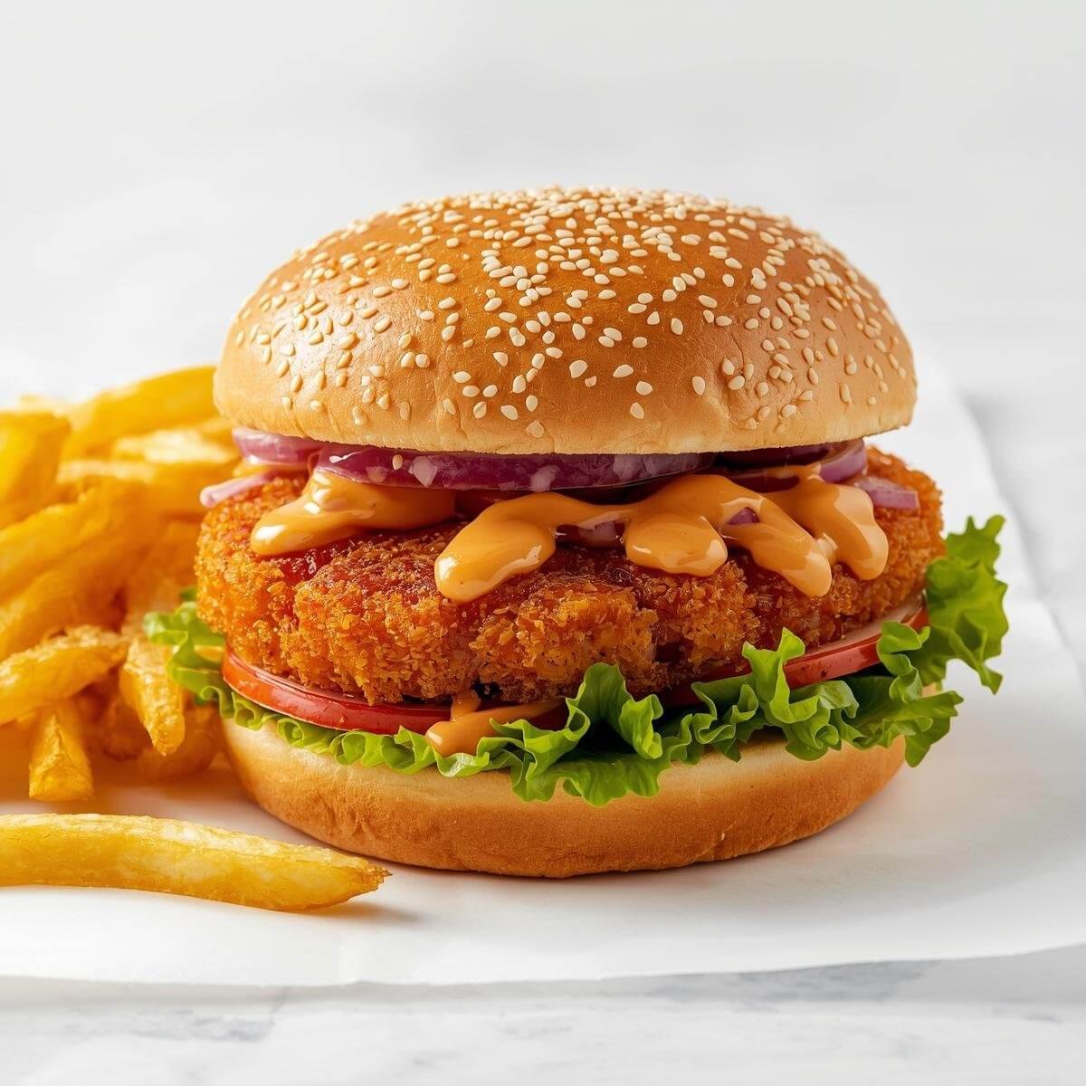 mit 100g Hähnchenfleisch-Patty, Gurken und Süß-Sauer-Sauce mit Pommes frites serviert.
