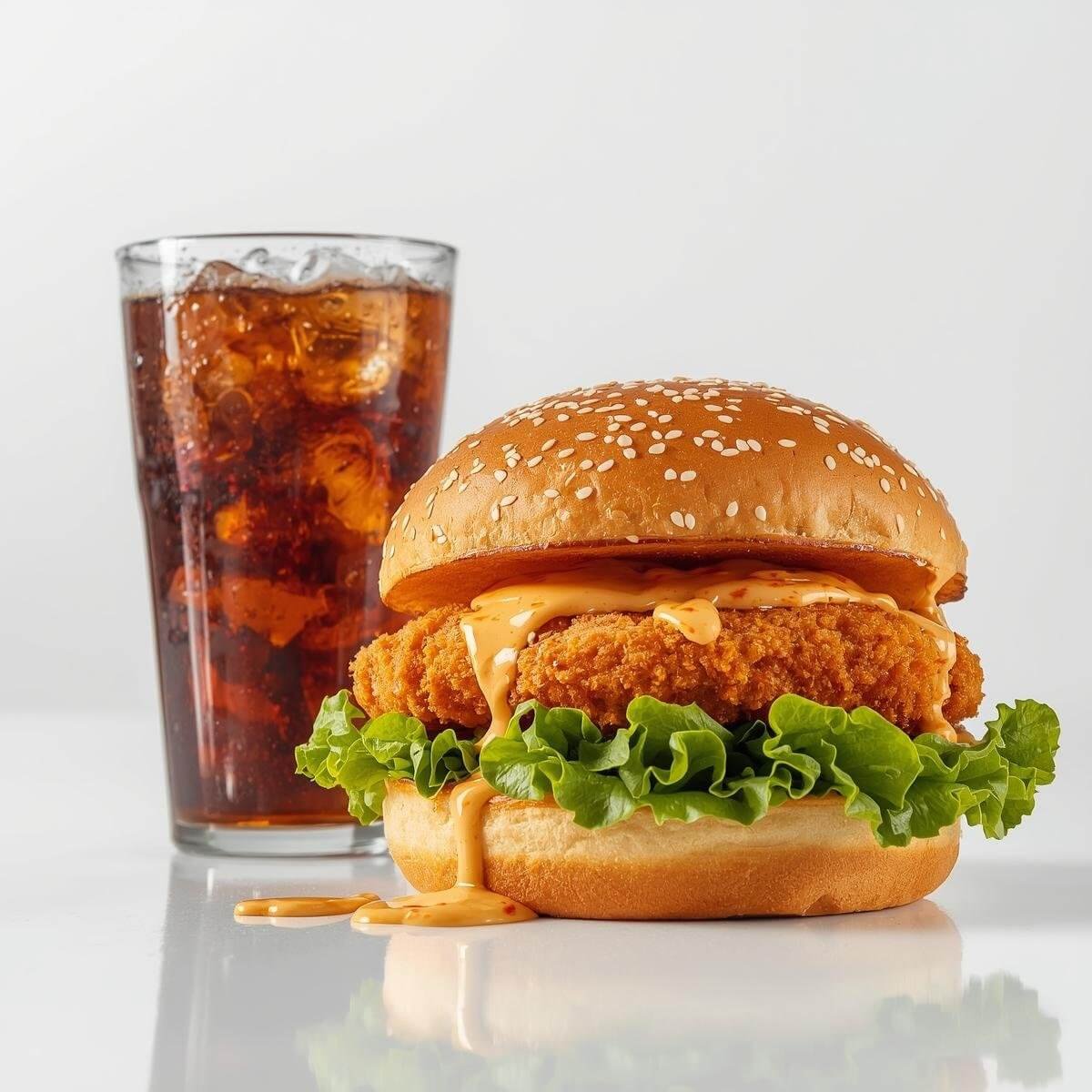 Ein knusprig-zarter Chicken Burger mit frischem Bun, goldbraunem Hähnchenfilet und dem besonderen Kick durch unseren cremig-würzigen Tandoori-Dip. Serviert mit einem eisgekühlten Cola – moderner Street-Food Genuss wie in Dubai! 🍔🥤🔥